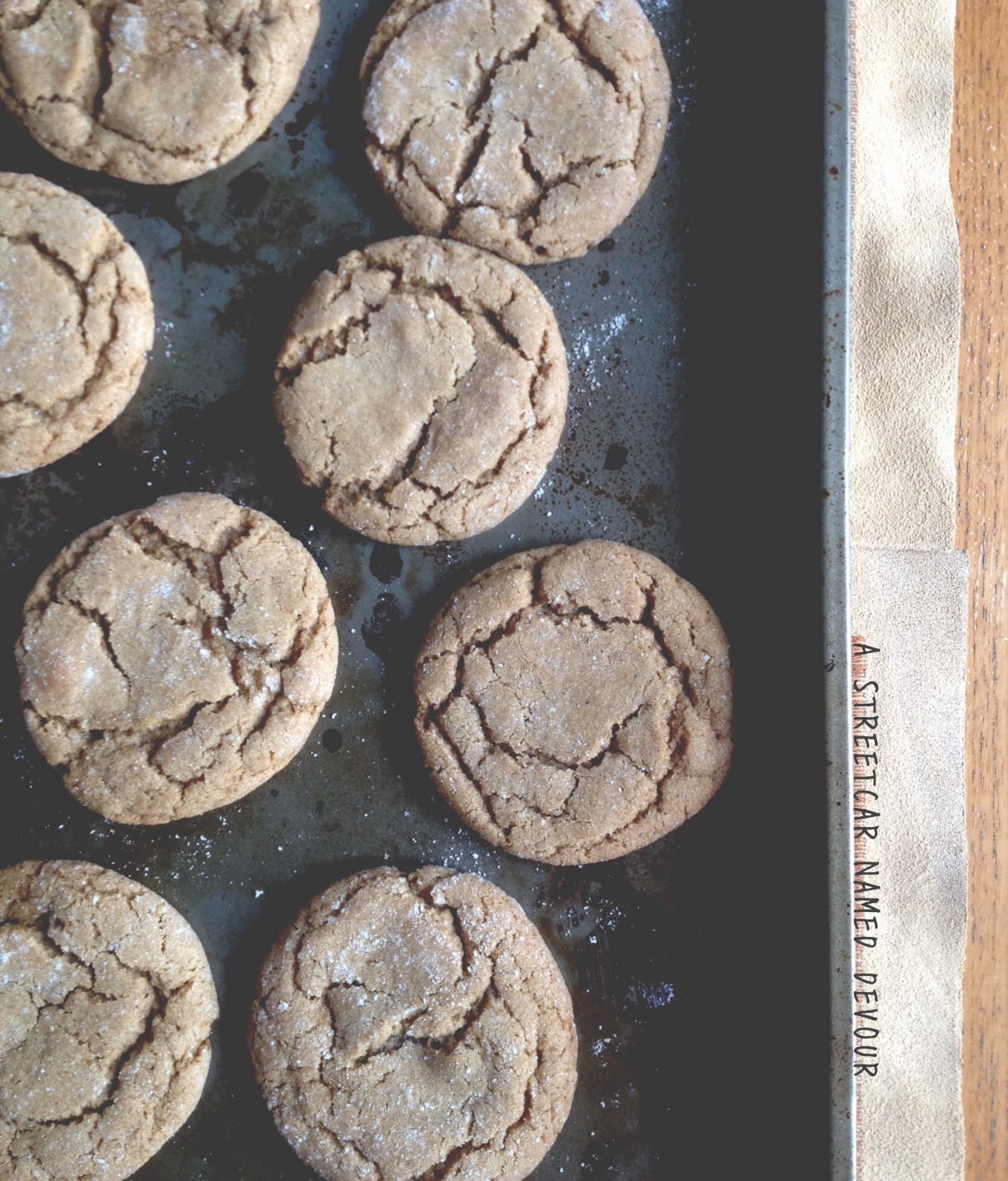 Once the butter has cooled down a bit, add to a mixing bowl with the paddle attachment and mix with the coconut sugar till fluffy. About 5 minutes on medium speed. Turn off the mixer and add the maple syrup, molasses, tahini, flaxseed egg and vanilla. Mix for another 2 minutes, or until incorporated.