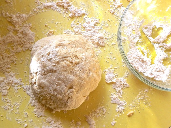 Place the dough ball onto a well-floured surface. Knead for about 5 minutes, adding bits of flour to keep it from getting sticky. You want the dough to feel somewhat smooth. Form the dough into a ball, add more flour to the surface and cover it with your bowl. Don’t lift the bowl at all. It’s nap time, let it rest for 1 hour.