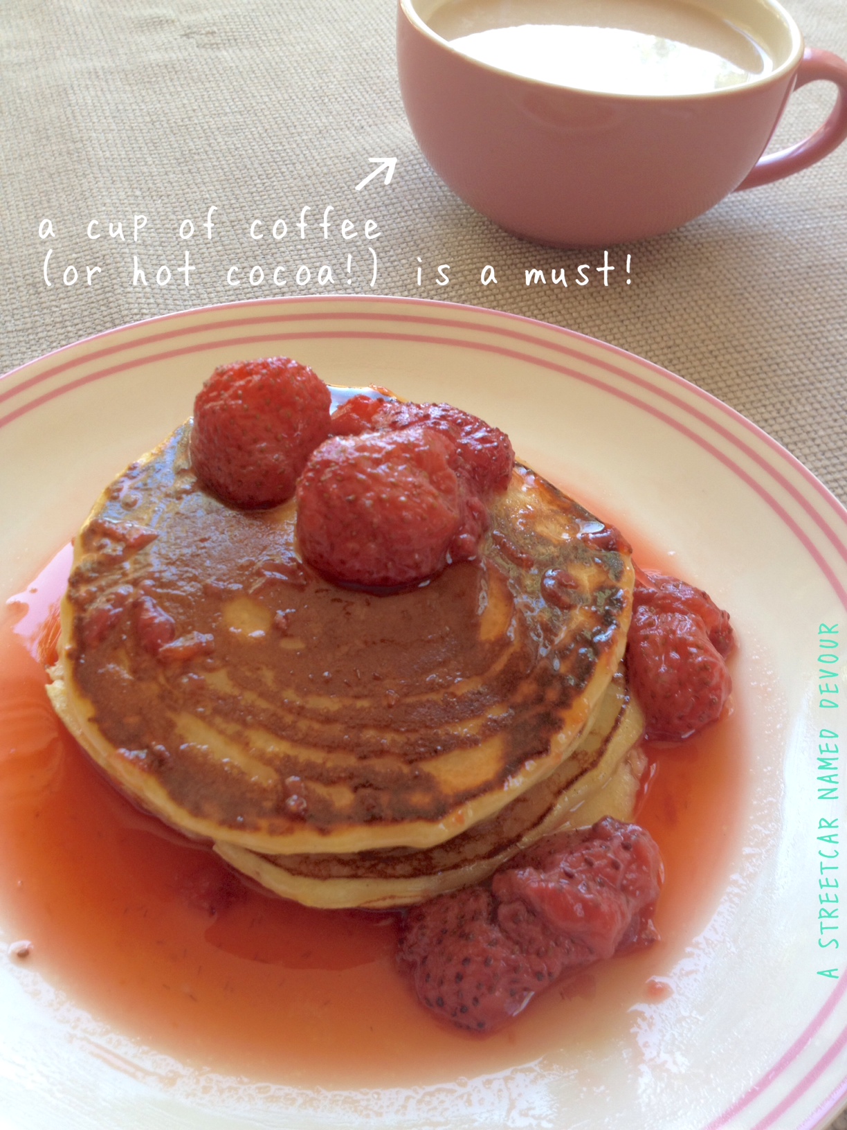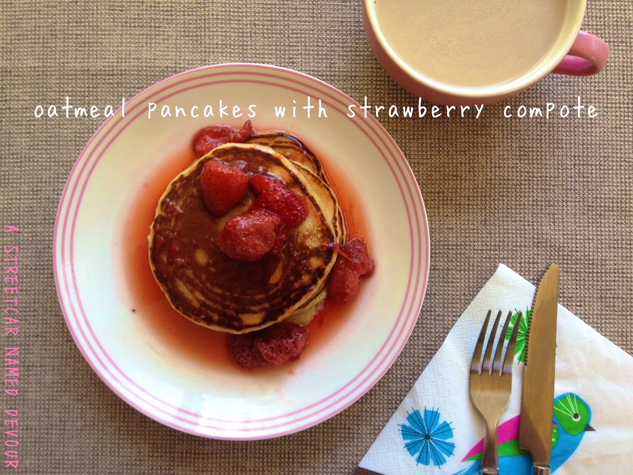 I dream of pancakes. Literally. I dream of all flavors: buttermilk, blueberry, chocolate chip, Bananas Foster, peanut butter and jelly, bacon-maple. I can totally emulate Bubba Blue from Forrest Gump and name off more combinations, but I’m sure you get the picture. I woke up one morning with the instant craving for oatmeal pancakes. Oatmeal is always in my pantry. And because I love me some strawberries (and they’re perfectly in season right now) I topped ’em with a strawberry compote.
